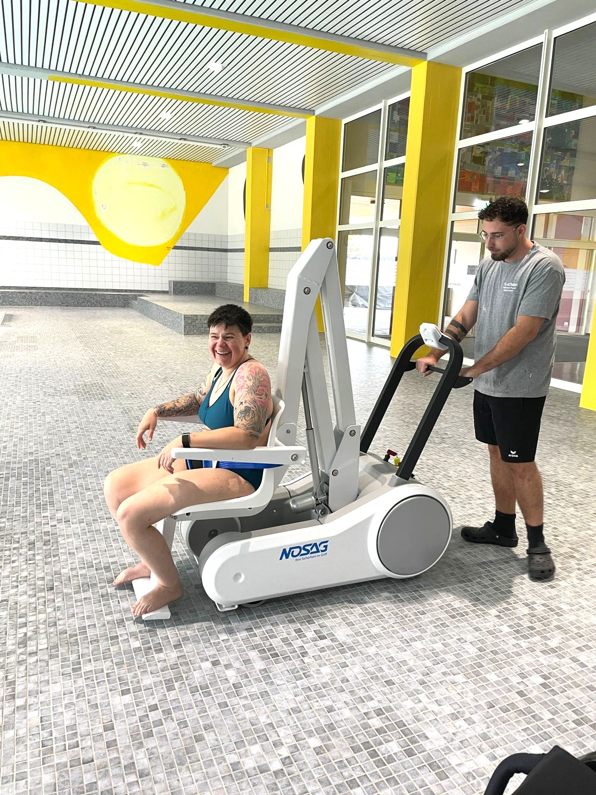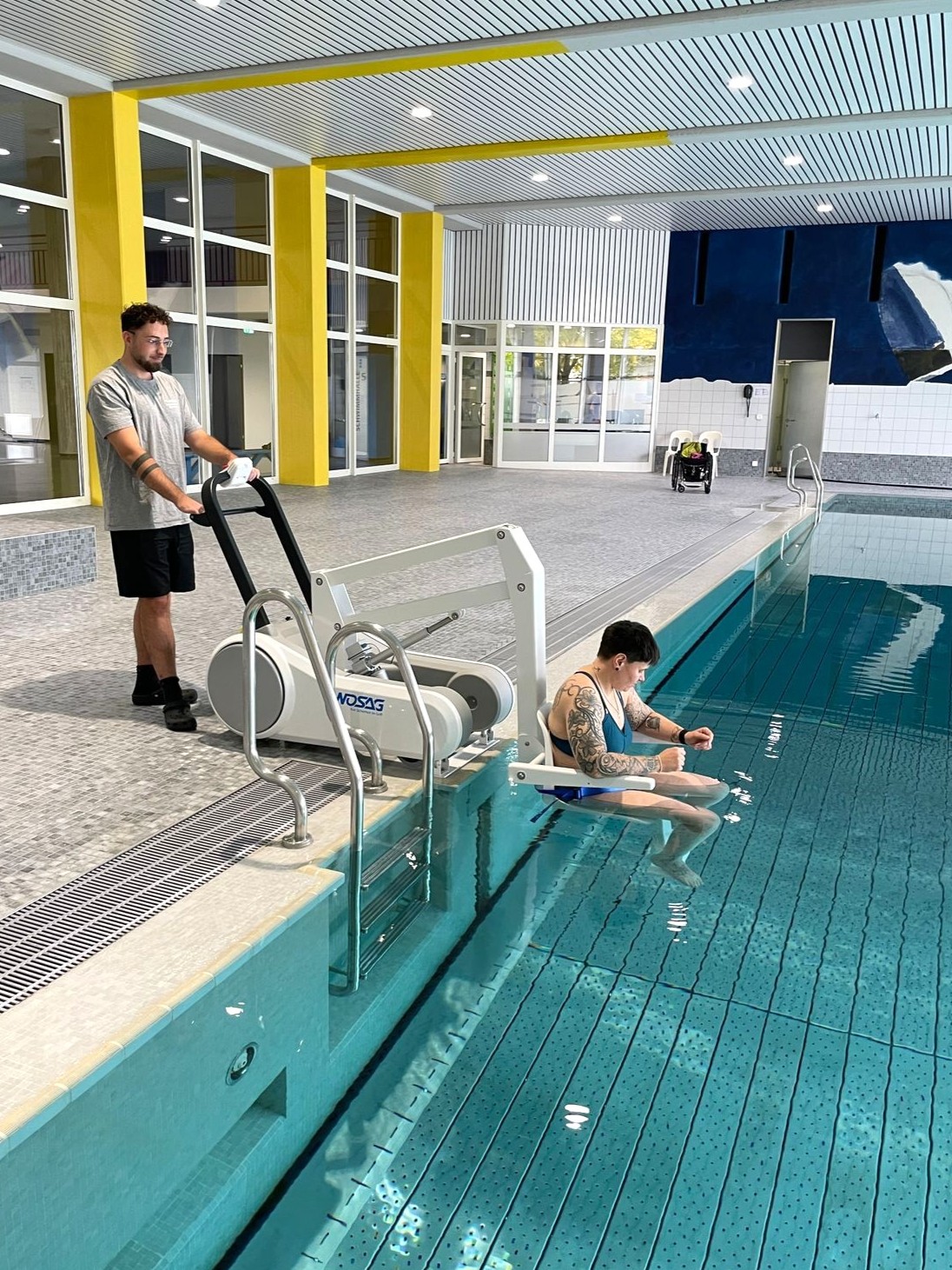 Für Menschen mit körperlichen Beeinträchtigungen stehen im Hallenbad Resch ein Baderollstuhl sowie ein mobiler Pool-Lift zur Verfügung. Der akkubetriebene Pool-Lift ermöglicht einen einfachen, bequemen und sicheren Zugang zum Wasser. Er ist jederzeit einsatzbereit und leicht zu bedienen. Bei Bedarf unterstützt das Bademeister-Team gerne.