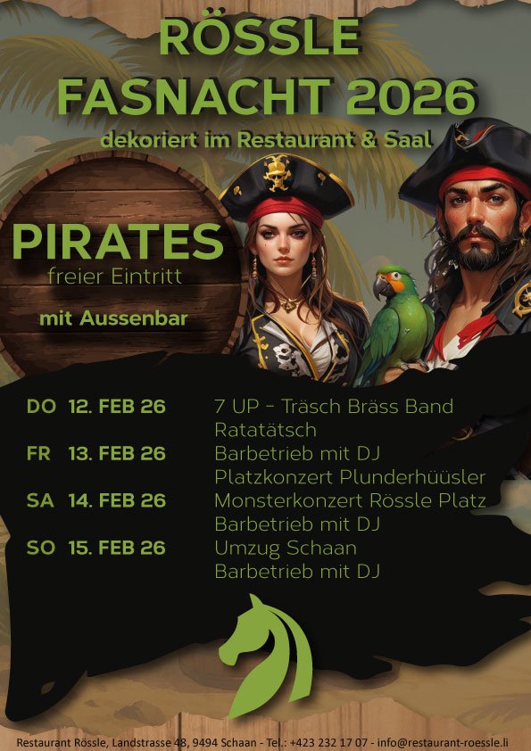 - Fasnachtssamstag (16 Uhr – open end): Monsterkonzert Rössle Platz, Barbetrieb mit DJ