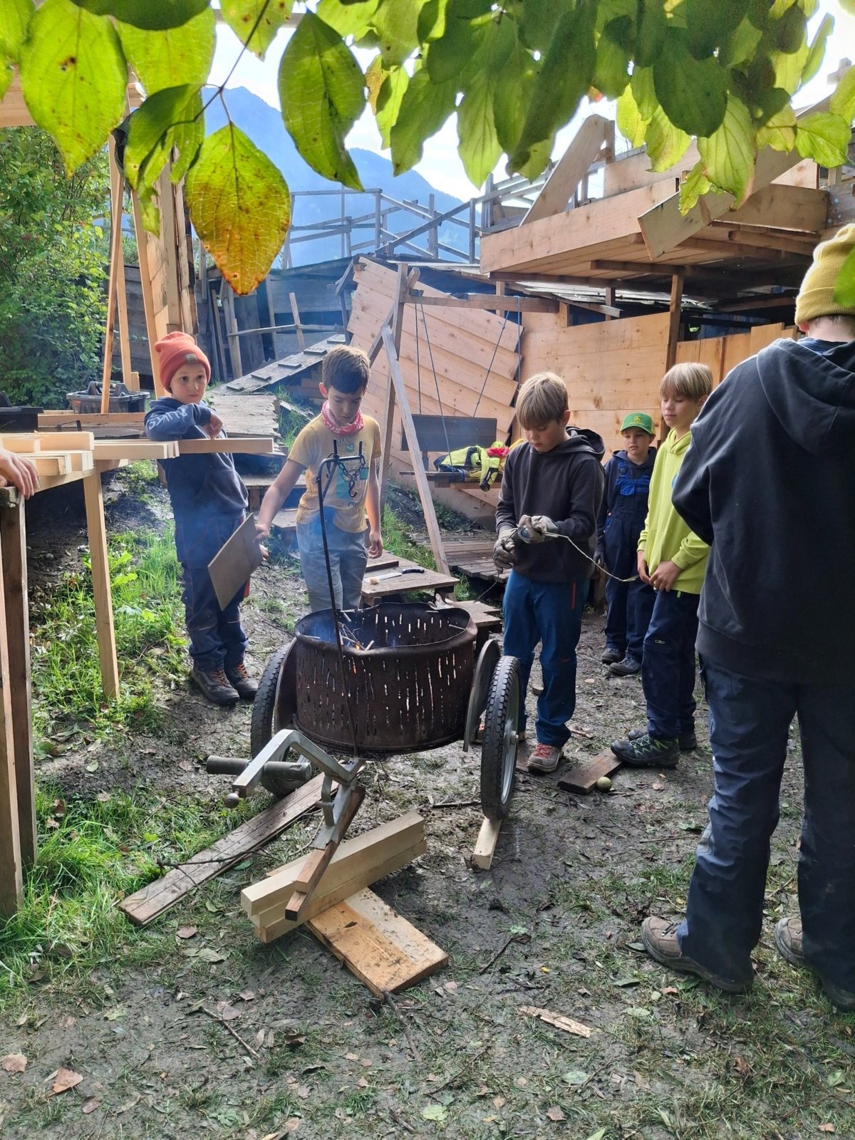 Neben den feurigen Aktivitäten stand natürlich der Hüttenbau, das Herzstück jeder Projektwoche, hoch im Beliebtheits-Kurs. Während einige Kinder weiter an den bestehenden Häuschen baute, wagten sich andere an Neues. Ein Team entwarf sogar ein richtiges Piratenschiff – ein echter Hingucker!