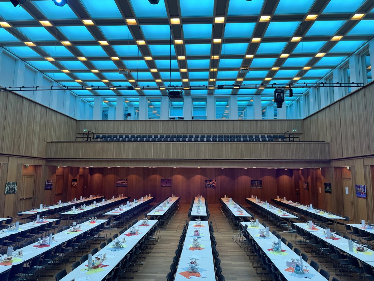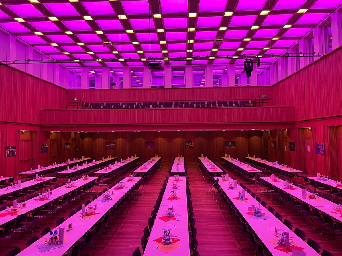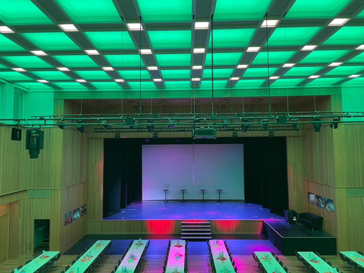 Da herkömmliche Leuchtstofflampen nicht mehr erlaubt sind, stand im vergangenen Jahr die Erneuerung der bestehenden Lichtdecke im Grossen Saal an. Ziel war es, eine moderne und energieeffiziente LED-Lösung zu realisieren, die sich harmonisch in die bestehende Architektur einfügt und gleichzeitig neue Möglichkeiten für Veranstaltungen bietet.