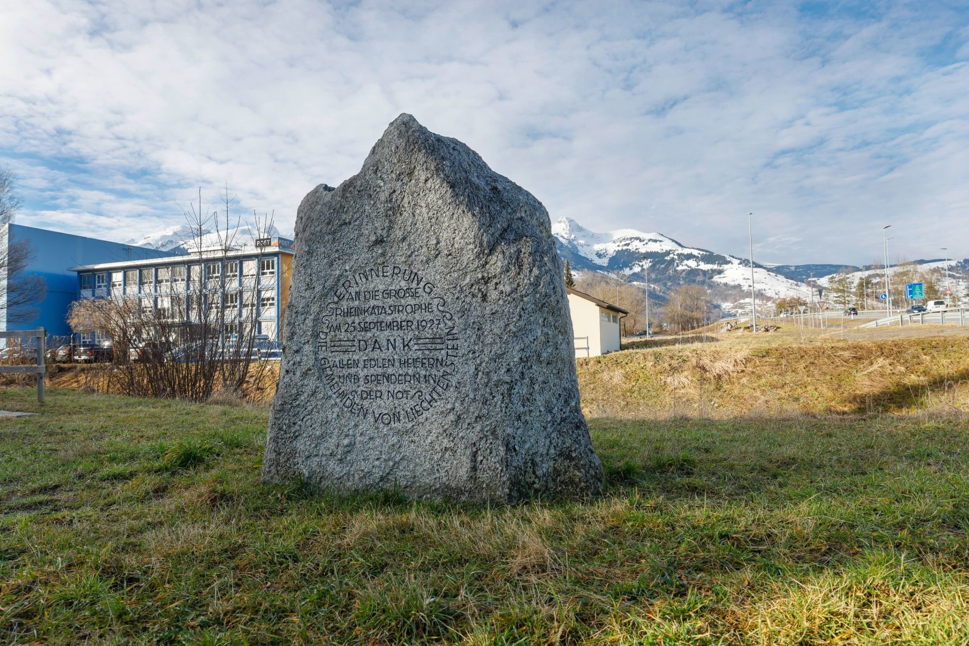 Der Rheindammbruch 1927 war für den armen Bauernstaat Liechtenstein eine Katastrophe, die nur dank einer Welle an Hilfsbereitschaft von Schweizer und Österreicher Soldaten sowie zahlreichen Freiwilligen bewältigt werden konnte. Finanziell konnte sich das damals arme Land für diese tatkräftige Hilfe nicht erkenntlich zeigen – dafür mit in Stein gemeisselten Worten. So wurde laut Volksblatt vom 21. September 1933 ein rund 250 Zentner schwerer Gneisblock unter grossen Mühen aus der Höhe von Planken an seinen Standort nördlich der Alten Zollstrasse geschafft. Die von Bildhauer Gottfried Hilti angefertigte Inschrift lautet: «Erinnerung an die grosse Rheinkatastrophe vom 25. September 1927. Dank allen edlen Helfern und Spendern in der Not. Die Gemeinden von Liechtenstein». Worte, die heute noch ans Herz gehen.