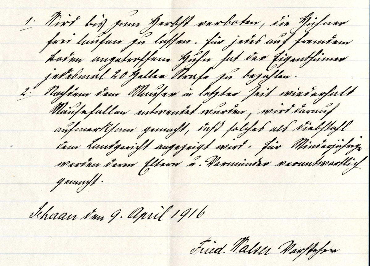 Am 9. April 1916 veröffentlichte Vorsteher Fritz Walser, nach dreijährigem Unterbruch zum zweiten Mal im Amt, beispielsweise eine Bekanntmachung, die sich zwei Aspekten des dörflichen Zusammenlebens widmete. Der erste lautete: «Wird bis zun Herbst verboten, die Hühner frei laufen zu lassen. Für jedes auf fremdem Boden angetroffene Huhn hat der Eigenthümer jedesmal 20 Heller Strafe zu bezahlen.» Der zweite: «Nachdem dem Mauser in letzter Zeit wiederholt Mäusefallen entwendet wurden, wird darauf aufmerksam gemacht, daß solches als Diebstahl dem Landgericht angezeigt wird. Für Minderjährige werden deren Eltern u. Vormünder verantwortlich gemacht.» Beide Bestimmungen sind auch vor dem Hintergrund des Ersten Weltkriegs zu sehen, der sich immer stärker auf die Versorgungslage der Bevölkerung mit Lebensmitteln auswirkte. Die Hühner hätten dem Federvieh des Grundbesitzers das Futter wegfressen können, und die Arbeit des Mäusefängers dämmte Schädlinge ein, welche die Ernte reduzierten – aber natürlich nur in dem Mass, wie er sein Tagwerk auch verrichten konnte.