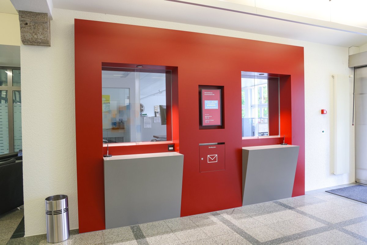 Wer das Rathaus betritt, sieht zuerst die beiden Schalter der Gemeindekasse. Dort kann man sich melden, wenn man Abfallmarken benötigt, etwas verloren hat oder