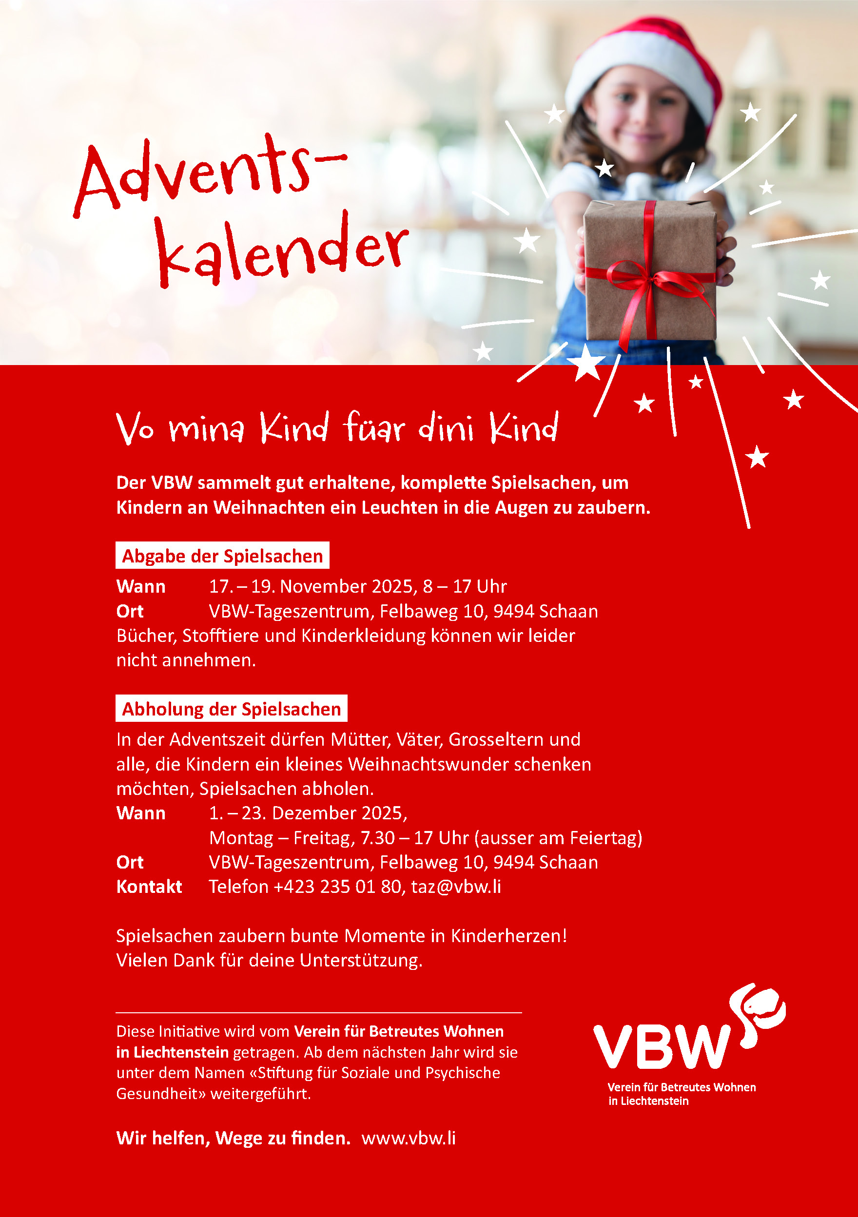 Vom 1. - 23. Dezember (Mo-Fr) dürfen dann all jene, die für ihre Kinder ein Weihnachtswunder brauchen, Spielsachen abholen.🎁🎅 www.vbw.li
