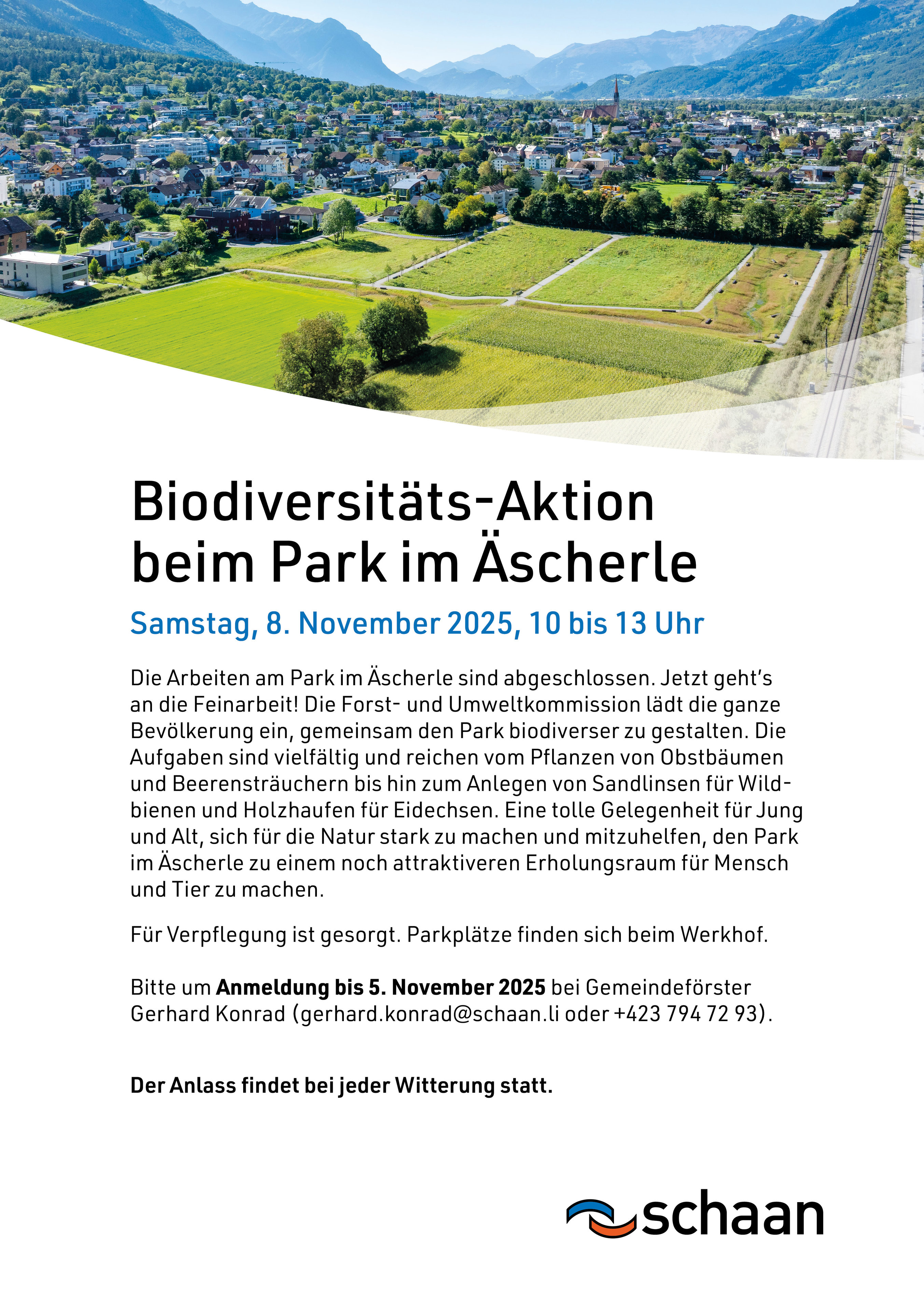 Am Samstag, 8. November 2025, von 10 - 13 Uhr, lädt die Forst- und Umweltkommission der Gemeinde alle ein, gemeinsam den Park im Äscherle biodiverser zu gestalten. Eine tolle Gelegenheit für Jung und Alt, sich für die Natur stark zu machen und mitzuhelfen, den Park zu einem attraktiveren Erholungsraum für Mensch und Tier zu machen.