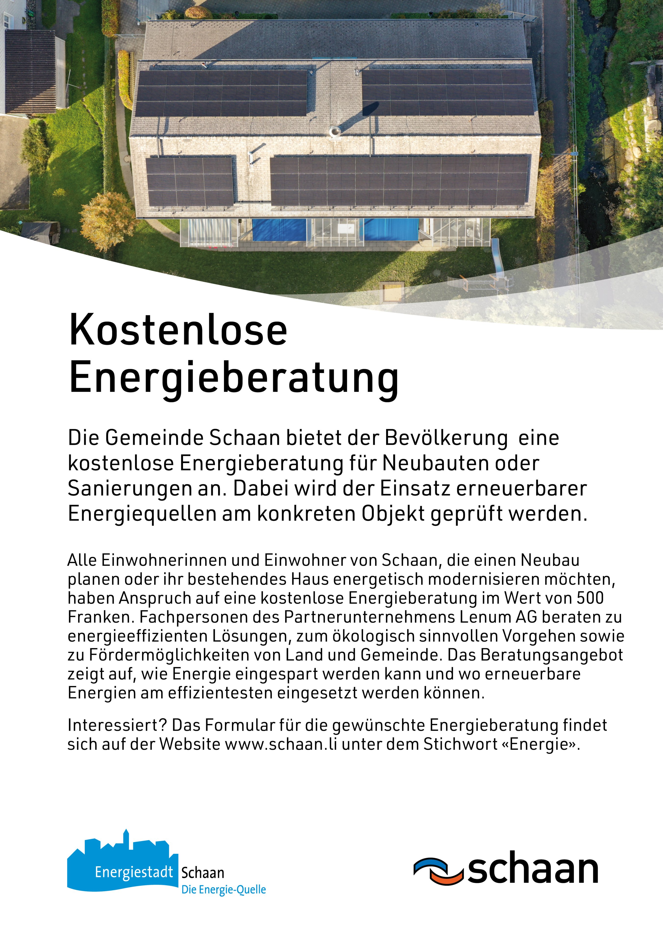 Die Gemeinde Schaan bietet der Bevölkerung eine kostenlose Energieberatung für Neubauten oder Sanierungen an. Dabei wird der Einsatz erneuerbarer Energiequellen am konkreten Objekt geprüft werden. Interessiert? Das Anmeldeformular finden Sie hier.