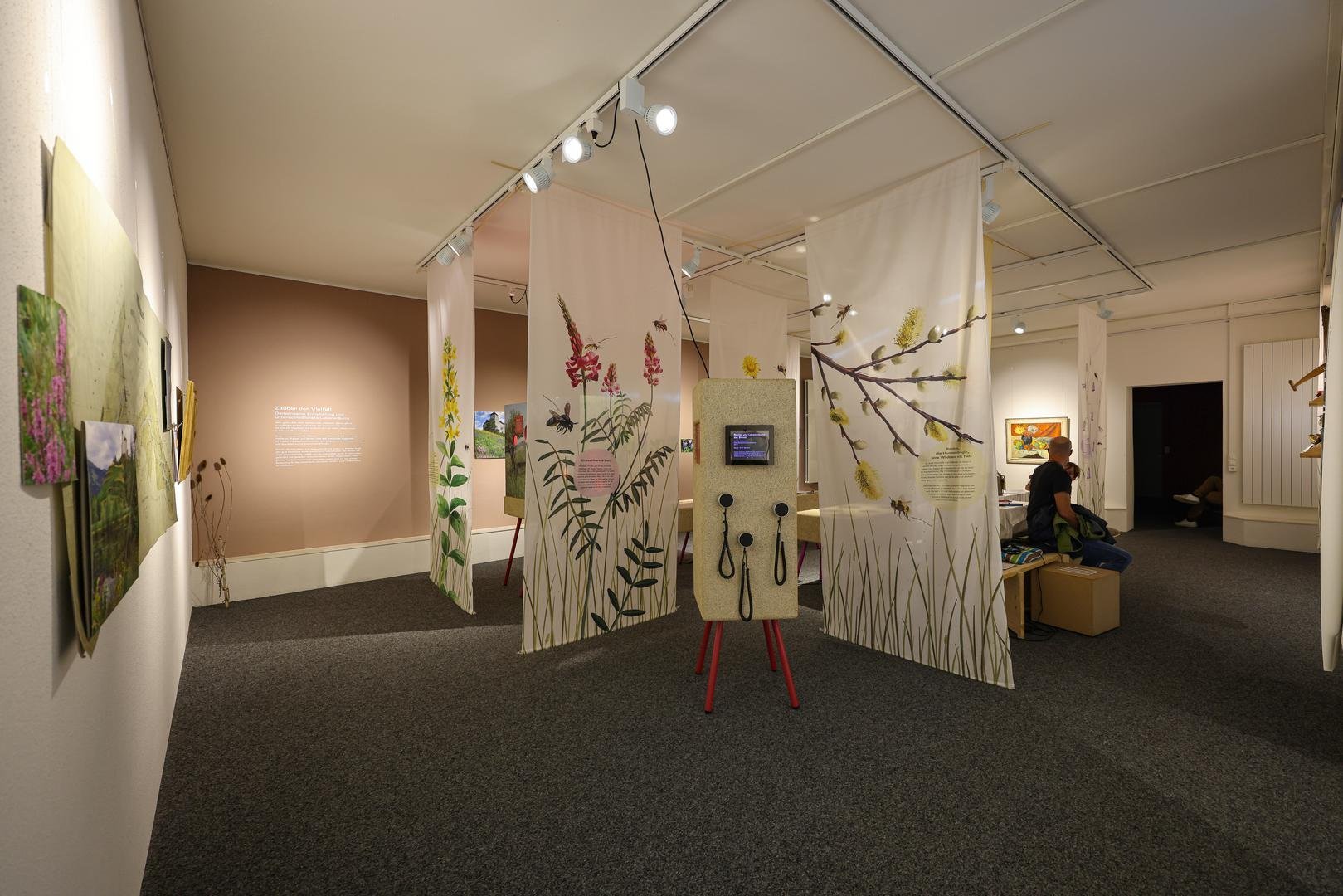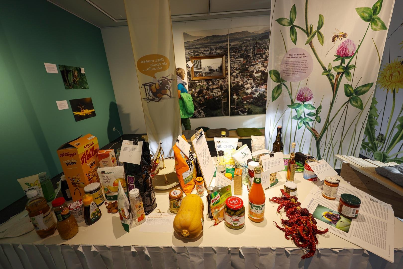 Die «Gabentische» mit den Lebensmitteln, die «toten Bienen» in grossformatigen Fotos, die Nahrungspflanzen für die Bienen, grosse Landschaftsbilder, Hörstationen und Fotos runden die Ausstellung ab.