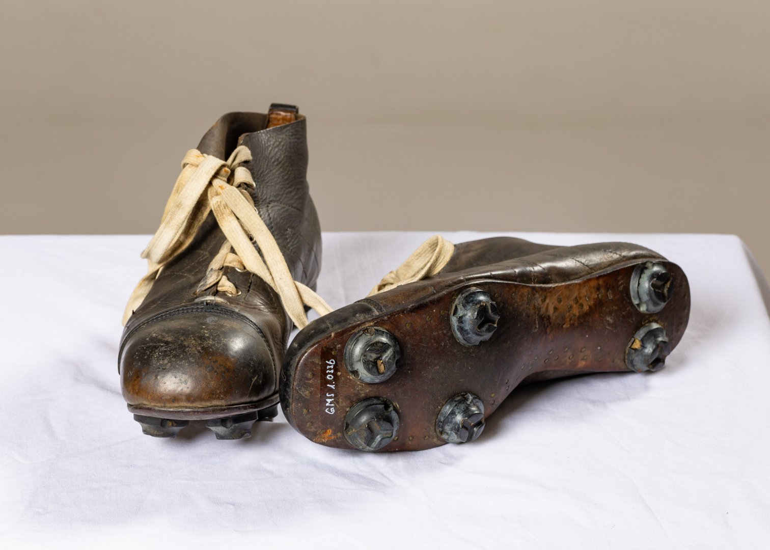 Gut erhaltene Fussballschuhe aus den 1930er-Jahren aus Leder.