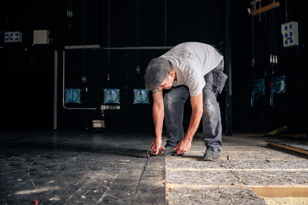 Schreiner Edgar Bargetze bei der Demontage des Bühnenbodens im TaKino | ZirkuLIE | Foto: Julian Konrad