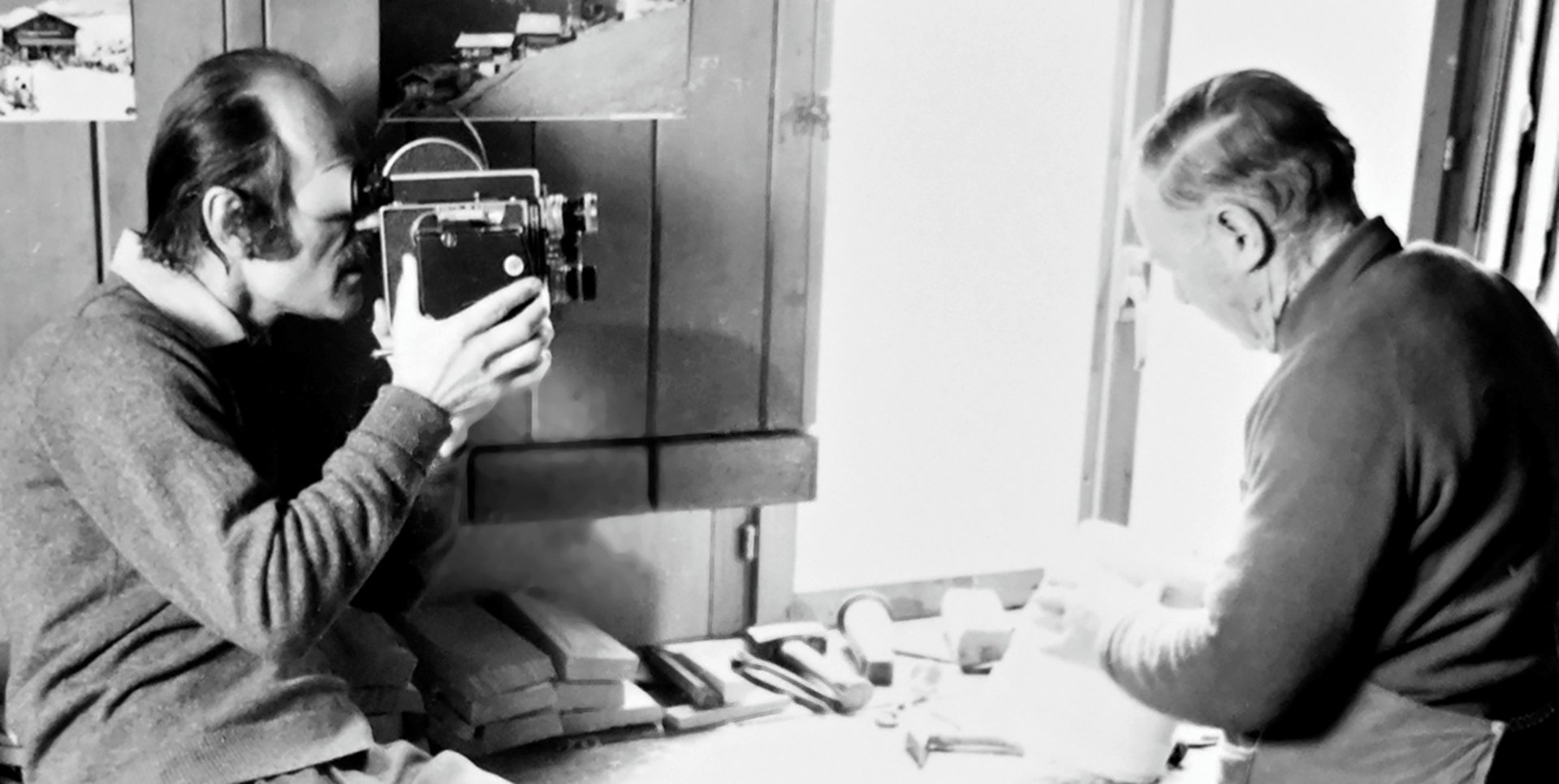 Bildnachweis: Walter Wachter dokumentiert die Herstellung eines Holzeimers durch den Weissküfer Xaver Schädler mit der Filmkamera, Triesenberg, 1968.
