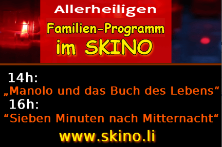 - "Manolo und das Buch des Lebens“ / 1.11.2023, 14 Uhr: farbenfroher, lustiger Animationsfilm rund um den "Día de Muertos" in Mexiko für Kinder ab 6 Jahren (weitere Infos hier: https://www.skino.li/?page=1&id=3013)