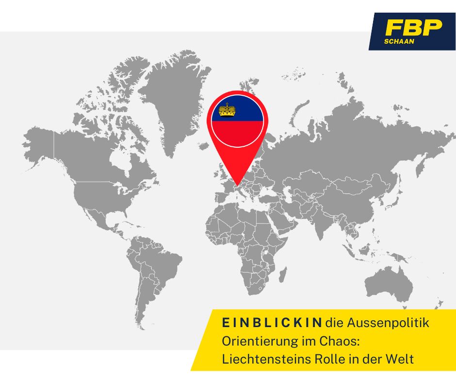 Die FBP Ortsgruppe Schaan lädt alle Interessierten zur Veranstaltung E I N B L I C K I N die Aussenpolitik “Orientierung im Chaos: Liechtensteins Rolle in der Welt” ein.