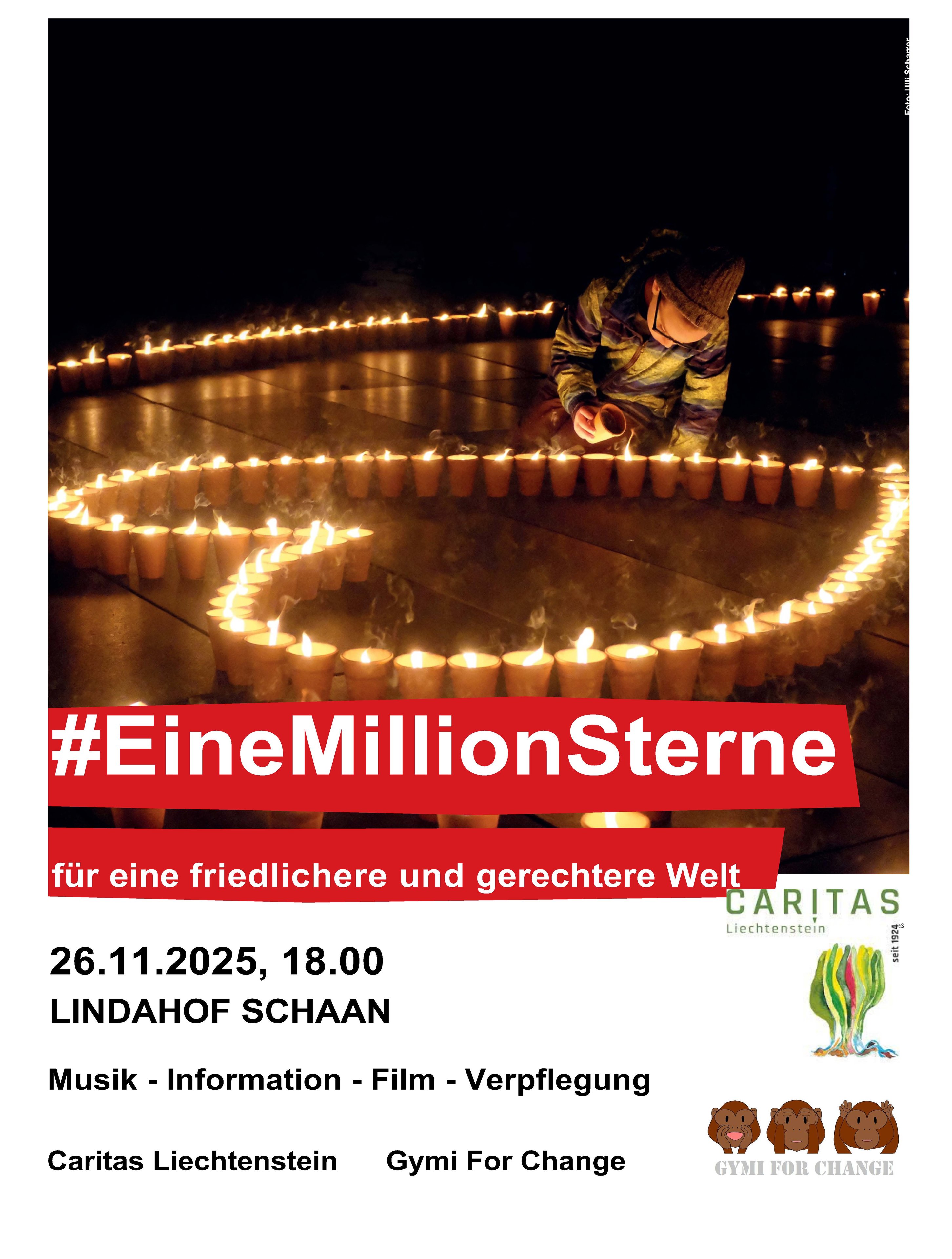 Bereits zum vierten Mal gestaltet Gymi For Change, eine Wahlfachgruppe des Liechtensteinischen Gymnasiums, am Mittwoch, den 26.11. von 18.00 bis 19.00 Uhr im Lindahof in Schaan die EINE MILLION-STERNE AKTION. Im Jahr 1984 in Frankreich entstanden, ist „Eine Million Sterne“ eine Aktion des internationalen Caritas-Netzwerkes - in unserem Land in Zusammenarbeit mit der Caritas Liechtenstein - mit dem Ziel, sichtbare Zeichen zu setzen für eine solidarische Gesellschaft und eine gerechtere Welt. Sie ruft uns auf, zu leuchten durch unser Mitgefühl und den Einsatz für Menschen in Not und für Gerechtigkeit und Frieden. Mit einem abwechslungsreichen Programm aus Musik und Tanz, Texten und Filmen und einem grossen Bodenbild aus Tonkerzen sollen Geist und Herz geöffnet und der Verein „WEVA“ in Gambia unterstützt werden. Eva Fahlbusch aus Bregenz hat diesen Verein ins Leben gerufen, um die Lebensumstände von Menschen in Gambia so zu verändern, dass sie nicht mehr gezwungen werden, nach Europa zu flüchten. Für Verpflegung vor Ort ist gesorgt.