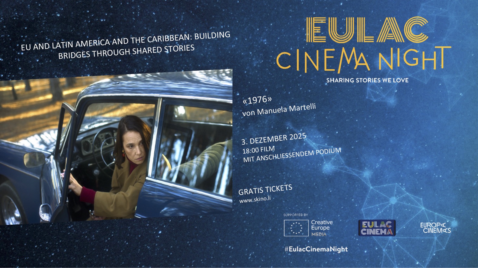 Als Mitglied von «Europa Cinema», dem Netzwerk der europäischen Filmkultur, hat das Skino die Ehre, die «EULAC Cinema Night 2025» zu veranstalten. Es handelt sich um eine Sonderausgabe der europäischen Kinonächte zu Lateinamerika und der Karibik, an der Filme präsentiert werden, die aus der internationalen Zusammenarbeit hervorgegangen sind.