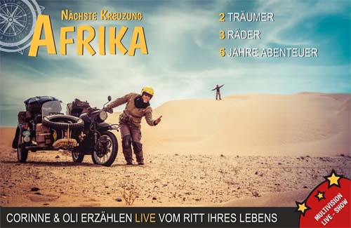 In ihrem packenden Erlebnis Vortrag „NÄCHSTE KREUZUNG AFRIKA“ erzählen Corinne und Oliver vom Abenteuer ihres Lebens. Der Vortrag im Multivision Stil lebt von der authentischen Erzählkunst, den humorvollen Anekdoten, den faszinierenden Bildern und Filmeinblicken und dem begeisternden Vortragsstil der Beiden. Damit erzeugen sie eine prickelnde Spannung – vom Anfang bis zum Schluss!