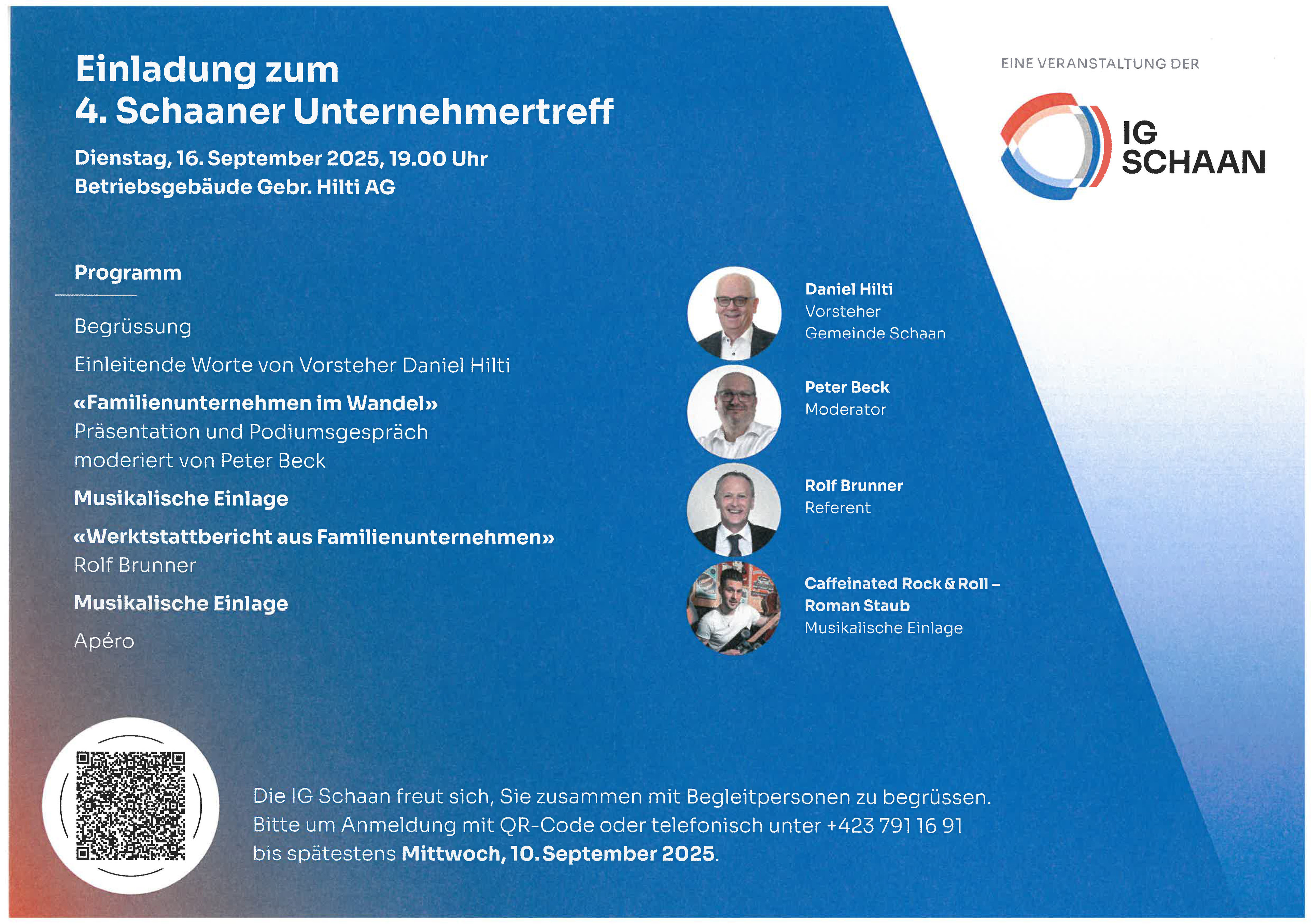 Die IG Schaan lädt am 16. September 2025 beim neuen Betriebsgebäude der Gebr. Hilti AG zum 4. Schaaner Unternehmertreff mit dem Thema "Familienunternehmen im Wandel" ein.