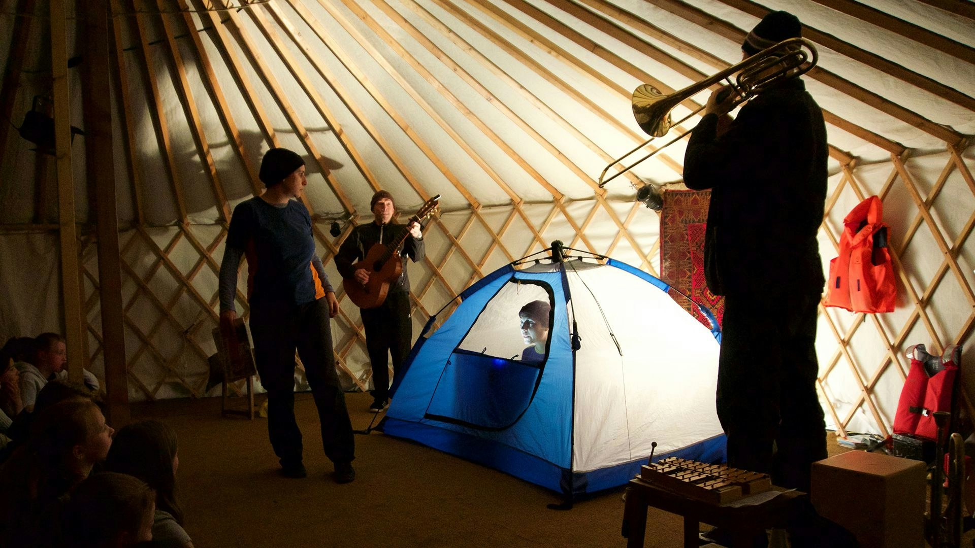 Dies ist die Geschichte zweier Jugendlicher aus Aleppo. Vor dem Hintergrund ihrer Reise durch die Türkei, Griechenland und Mazedonien erzählen sie Geschichten über Menschen, Dinge und Orte, und über ihren Alltag auf der Flucht. Das Publikum ist in die behagliche Enge einer mongolischen Jurte eingeladen, in der mit Schauspiel, Live-Musik und Schattentheater von den Gefahren des Unterwegsseins, von der Suche nach Zufluchtsorten und vom Ankommen erzählt wird.